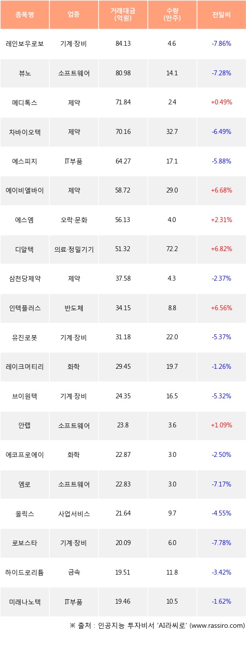 메디톡스, 에이비엘바이오, 에스엠 등은 전일 대비 주가가 상승했고, 레인보우로보틱스, 뷰노, 차바이오텍 등은 주가가 하락했다.