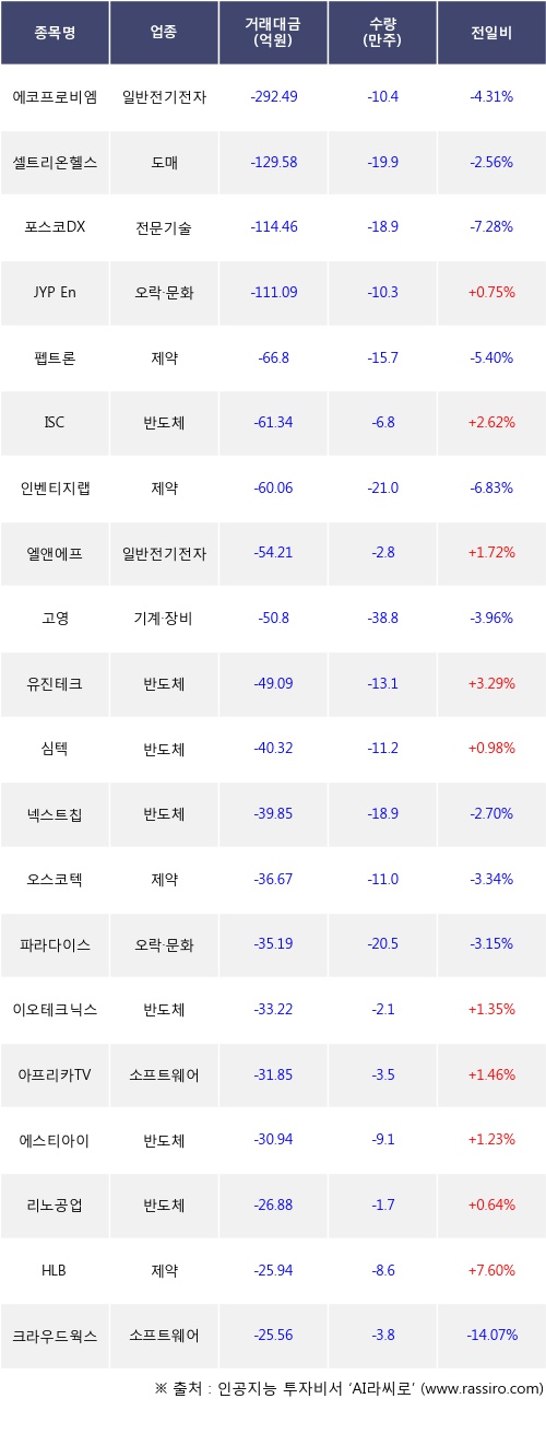 외국인 투자자의 순매도 상위 20개 종목은 에코프로비엠, 셀트리온헬스케어, 포스코DX, JYP Ent., 펩트론, ISC, 인벤티지랩, 엘앤에프, 고영, 유진테크등이다.