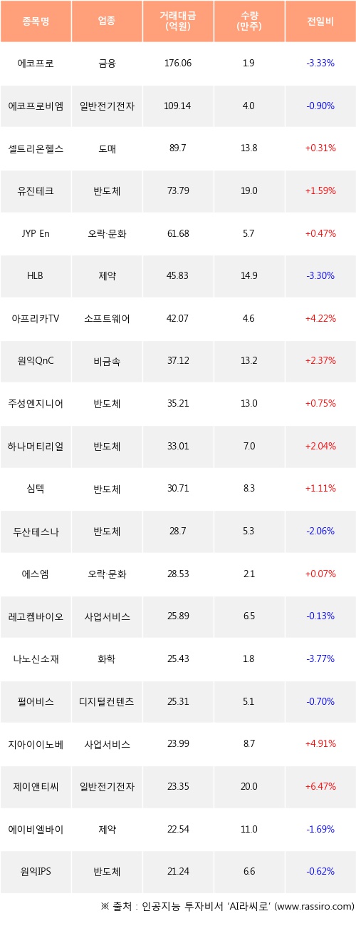셀트리온헬스케어, 유진테크, JYP Ent. 등은 전일 대비 주가가 상승했고, 에코프로, 에코프로비엠, HLB 등은 주가가 하락했다.