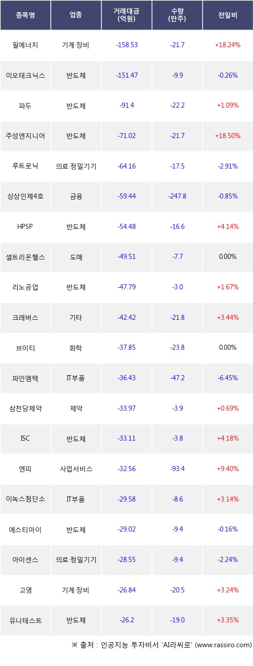 기관 투자자의 순매도 상위 20개 종목은 필에너지, 이오테크닉스, 파두, 주성엔지니어링, 루트로닉, 상상인제4호스팩, HPSP, 셀트리온헬스케어, 리노공업, 크레버스등이다.