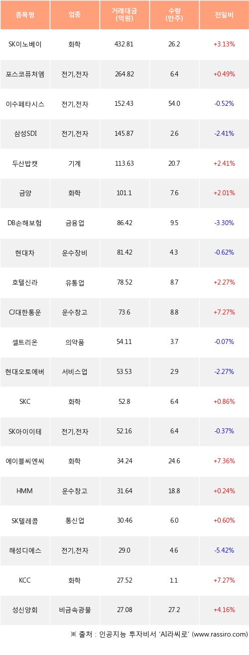 SK이노베이션, 포스코퓨처엠, 두산밥캣 등은 전일 대비 주가가 상승했고, 이수페타시스, 삼성SDI, DB손해보험 등은 주가가 하락했다.