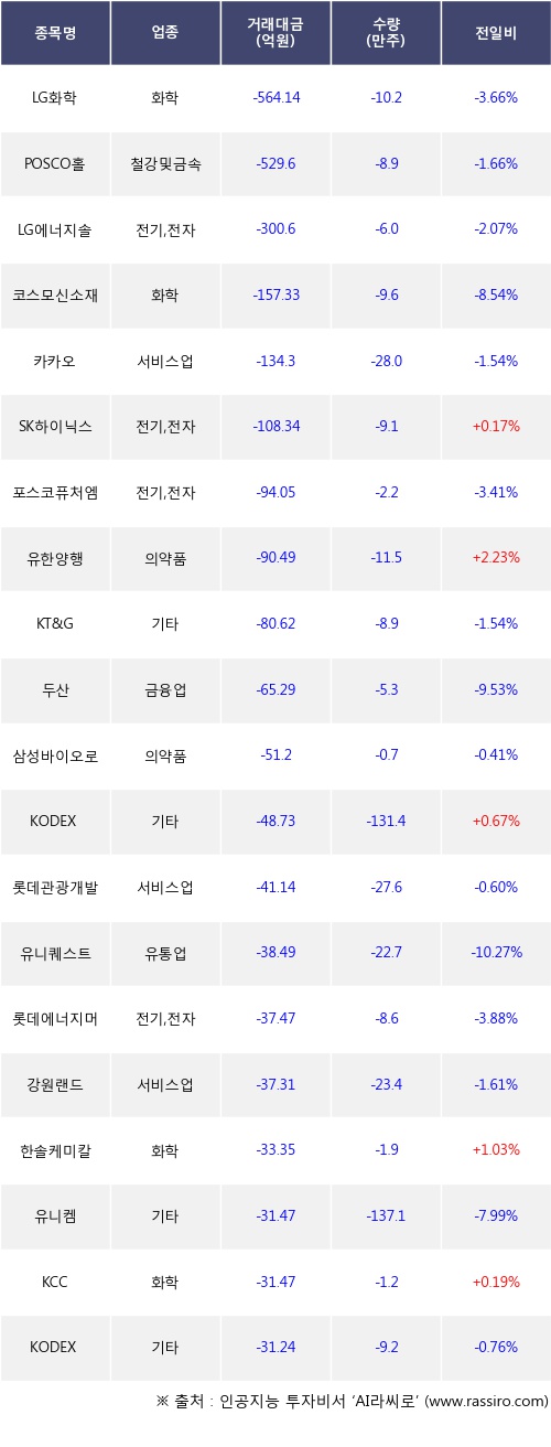 외국인 투자자의 순매도 상위 20개 종목은 LG화학, POSCO홀딩스, LG에너지솔루션, 코스모신소재, 카카오, SK하이닉스, 포스코퓨처엠, 유한양행, KT&G, 두산등이다.