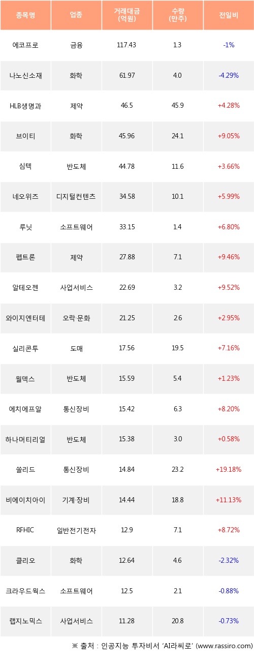 HLB생명과학, 브이티, 심텍 등은 전일 대비 주가가 상승했고, 에코프로, 나노신소재, 클리오 등은 주가가 하락했다.