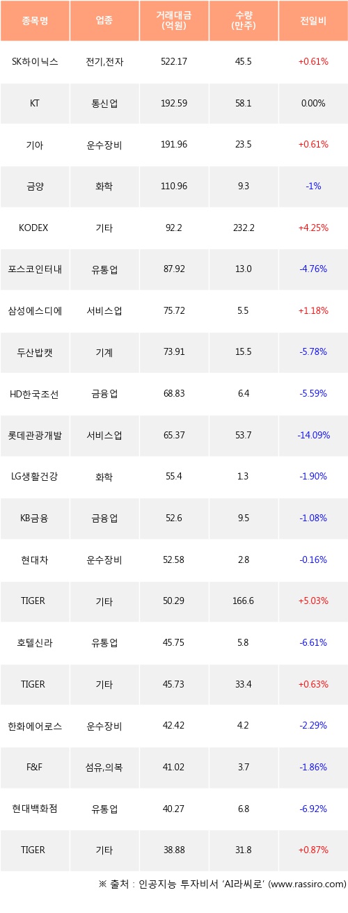 외국인 투자자의 순매수 상위 20개 종목은 SK하이닉스, KT, 기아, 금양, KODEX 코스닥150선물인버스, 포스코인터내셔널, 삼성에스디에스, 두산밥캣, HD한국조선해양, 롯데관광개발등이다.
