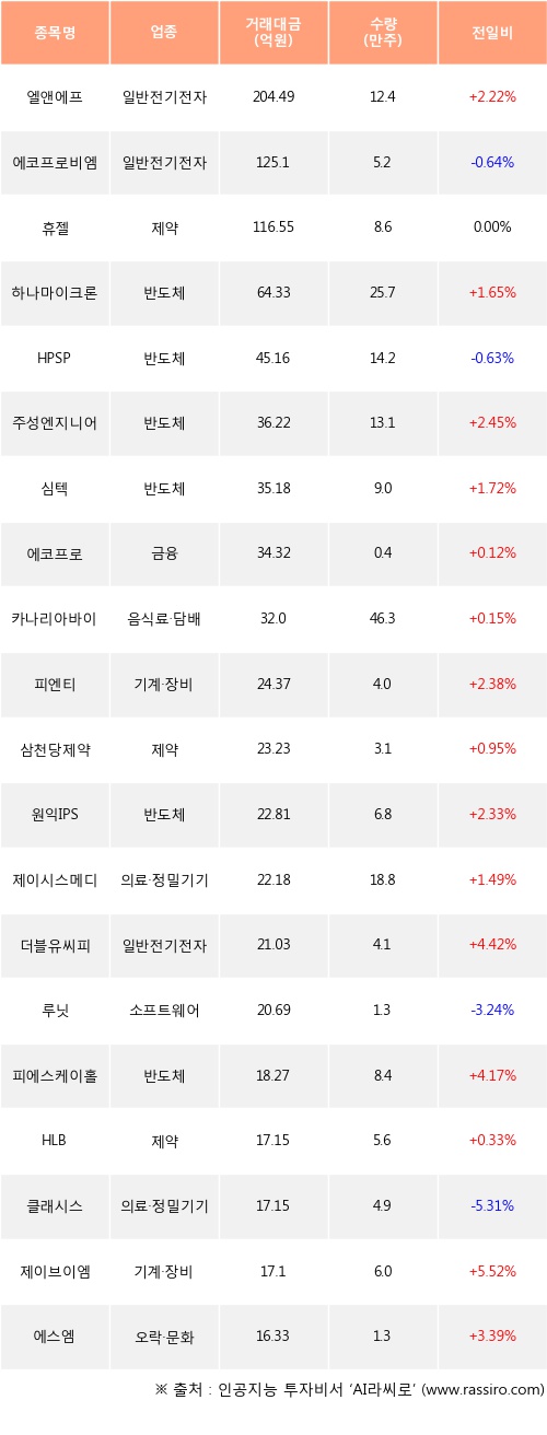 기관 투자자의 순매수 상위 20개 종목은 엘앤에프, 에코프로비엠, 휴젤, 하나마이크론, HPSP, 주성엔지니어링, 심텍, 에코프로, 카나리아바이오, 피엔티등이다.