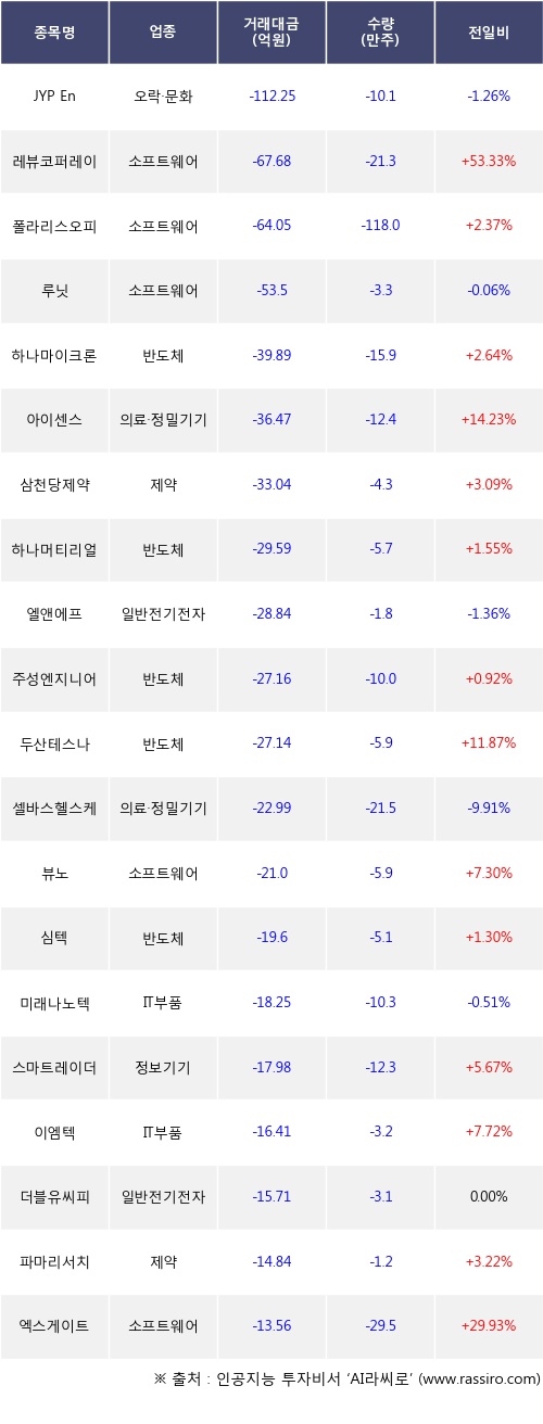외국인 투자자의 순매도 상위 20개 종목은 JYP Ent., 레뷰코퍼레이션, 폴라리스오피스, 루닛, 하나마이크론, 아이센스, 삼천당제약, 하나머티리얼즈, 엘앤에프, 주성엔지니어링등이다.