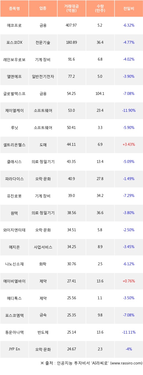 셀트리온헬스케어, 에이비엘바이오 등은 전일 대비 주가가 상승했고, 에코프로, 포스코DX, 레인보우로보틱스 등은 주가가 하락했다.