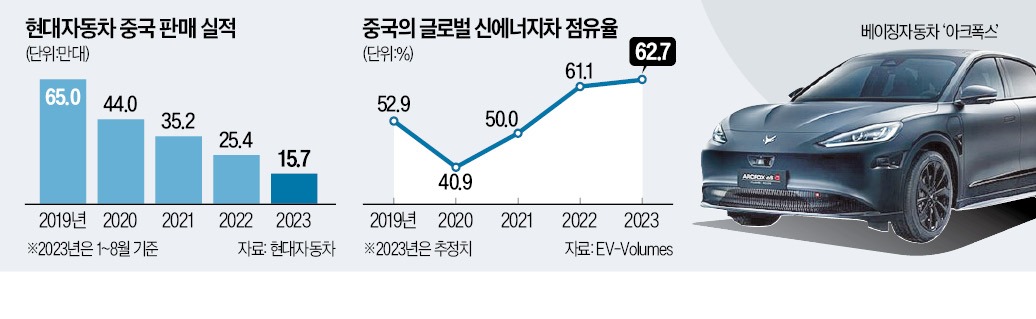 중국 시장에서 판매 부진에 시달린 현대차는 당초 아이오닉 등 자사 전기차 모델의 중국 공장 생산을 추진했다. 하지만 현대차 고위 경영진이 최근 베이징을 방문한 뒤 기존 계획을 미루기로 한 것으로 알려졌다. 이미 중국 브랜드가 시장을 장악한 상황에서 현대차 브랜드로 맞붙는 것은 불리하다는 판단에서다. 이에 아크폭스 생산으로 방향을 틀고, 베이징자동차와 관련 협의를 이어왔다. 현지 관계자는 “전기차 생산라인 구축을 통해 중국 시장 재공략의 교두보를 마련하려는 것”이라고 설명했다.