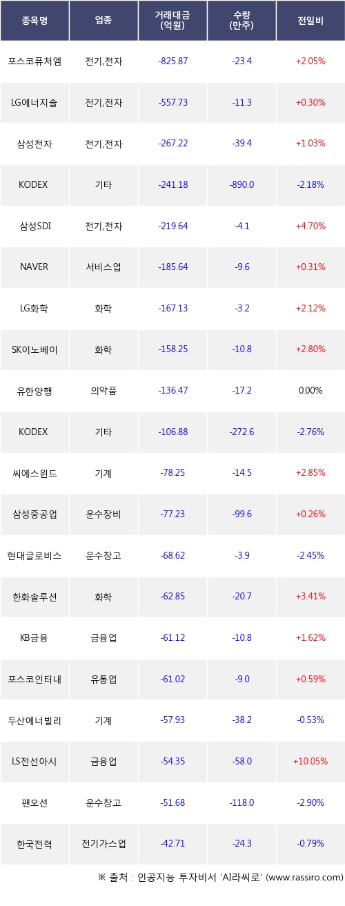 외국인 투자자의 순매도 상위 20개 종목은 포스코퓨처엠, LG에너지솔루션, 삼성전자, KODEX 200선물인버스2X, 삼성SDI, NAVER, LG화학, SK이노베이션, 유한양행, KODEX 코스닥150선물인버스등이다.