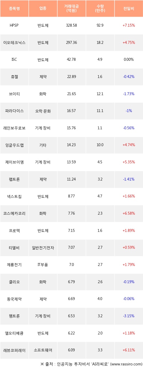 기관 투자자의 순매수 상위 20개 종목은 HPSP, 이오테크닉스, ISC, 휴젤, 브이티, 파라다이스, 레인보우로보틱스, 잉글우드랩, 제이브이엠, 펩트론등이다.