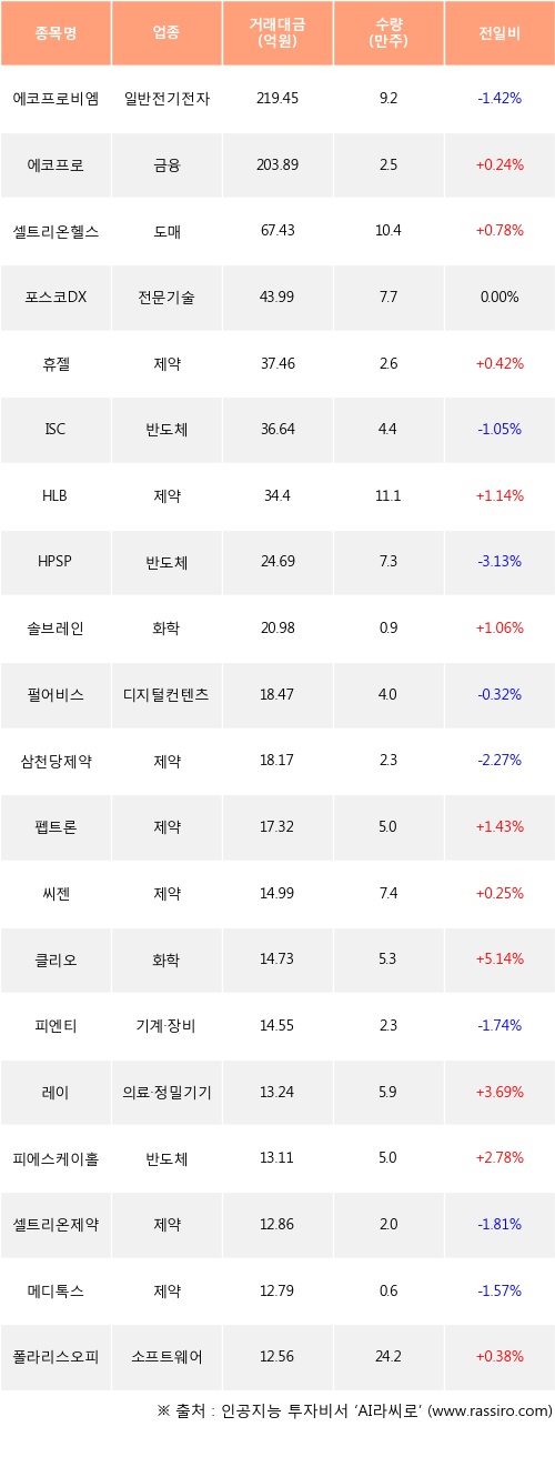 에코프로, 셀트리온헬스케어, 휴젤 등은 전일 대비 주가가 상승했고, 에코프로비엠, ISC, HPSP 등은 주가가 하락했다.