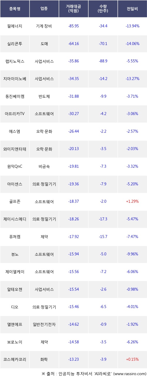 기관 투자자의 순매도 상위 20개 종목은 필에너지, 실리콘투, 랩지노믹스, 지아이이노베이션, 동진쎄미켐, 아프리카TV, 에스엠, 와이지엔터테인먼트, 원익QnC, 아이센스등이다.