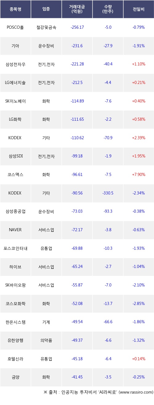 외국인 투자자의 순매도 상위 20개 종목은 POSCO홀딩스, 기아, 삼성전자우, LG에너지솔루션, SK이노베이션, LG화학, KODEX 레버리지, 삼성SDI, 코스맥스, KODEX 200선물인버스2X등이다.