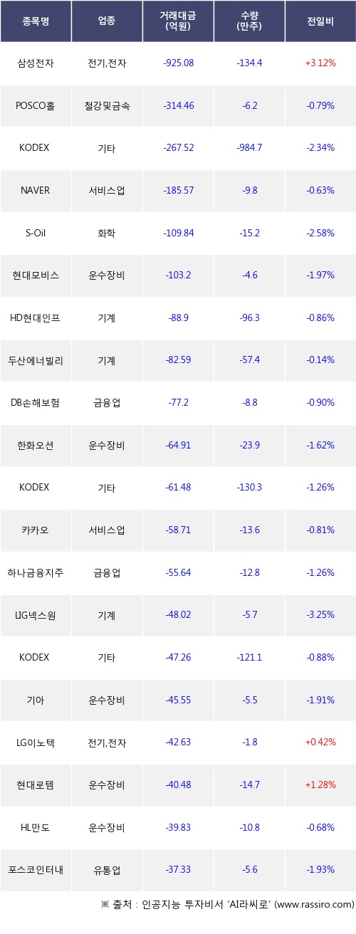 기관 투자자의 순매도 상위 20개 종목은 삼성전자, POSCO홀딩스, KODEX 200선물인버스2X, NAVER, S-Oil, 현대모비스, HD현대인프라코어, 두산에너빌리티, DB손해보험, 한화오션등이다.