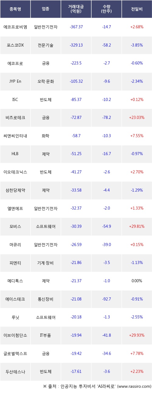 외국인 투자자의 순매도 상위 20개 종목은 에코프로비엠, 포스코DX, 에코프로, JYP Ent., ISC, 비츠로테크, 씨앤씨인터내셔널, HLB, 이오테크닉스, 삼천당제약등이다.