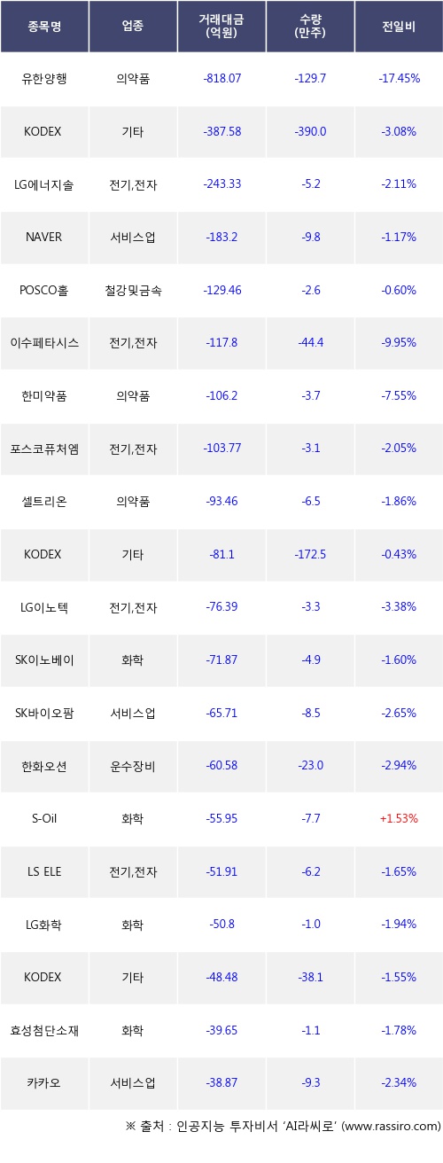 기관 투자자의 순매도 상위 20개 종목은 유한양행, KODEX 코스닥150레버리지, LG에너지솔루션, NAVER, POSCO홀딩스, 이수페타시스, 한미약품, 포스코퓨처엠, 셀트리온, KODEX 인버스등이다.