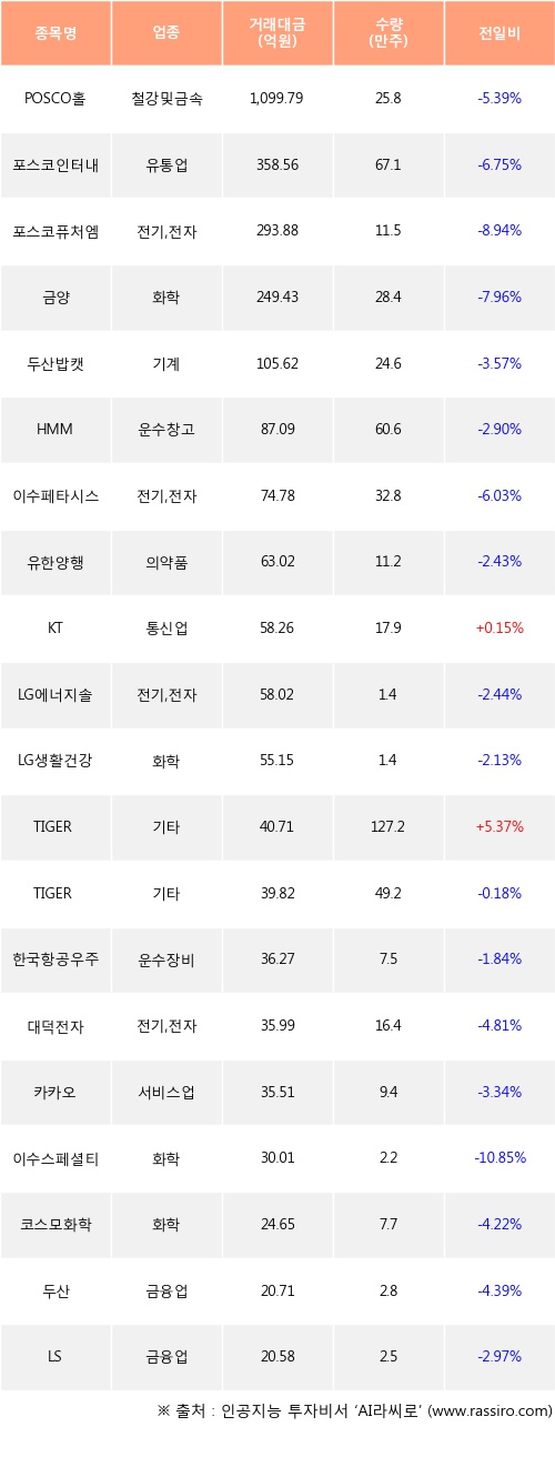 KT, TIGER 200선물인버스2X 등은 전일 대비 주가가 상승했고, POSCO홀딩스, 포스코인터내셔널, 포스코퓨처엠 등은 주가가 하락했다.