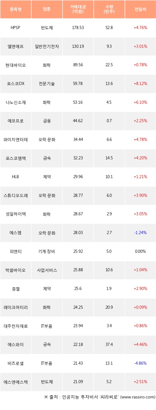 외국인 투자자의 순매수 상위 20개 종목은 HPSP, 엘앤에프, 현대바이오, 포스코DX, 나노신소재, 에코프로, 와이지엔터테인먼트, 포스코엠텍, HLB, 스튜디오드래곤등이다.