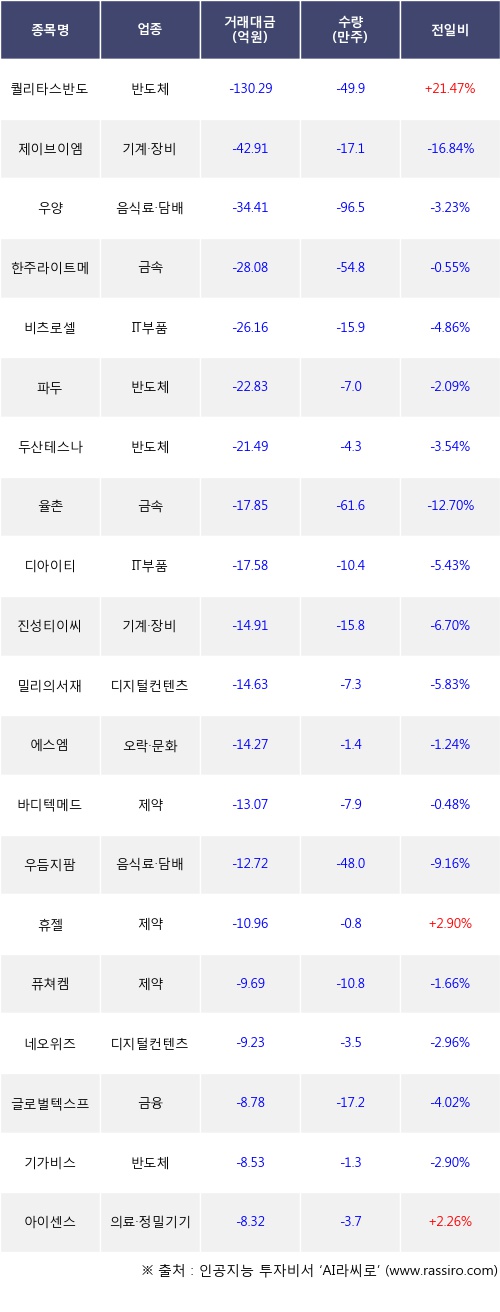 기관 투자자의 순매도 상위 20개 종목은 퀄리타스반도체, 제이브이엠, 우양, 한주라이트메탈, 비츠로셀, 파두, 두산테스나, 율촌, 디아이티, 진성티이씨등이다.