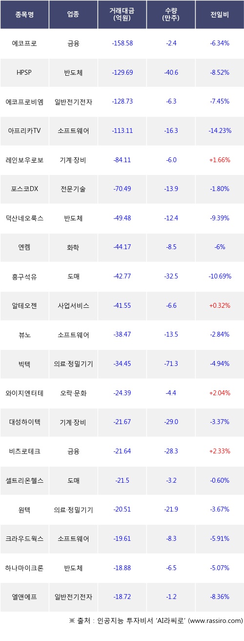 외국인 투자자의 순매도 상위 20개 종목은 에코프로, HPSP, 에코프로비엠, 아프리카TV, 레인보우로보틱스, 포스코DX, 덕산네오룩스, 엔켐, 흥구석유, 알테오젠등이다.