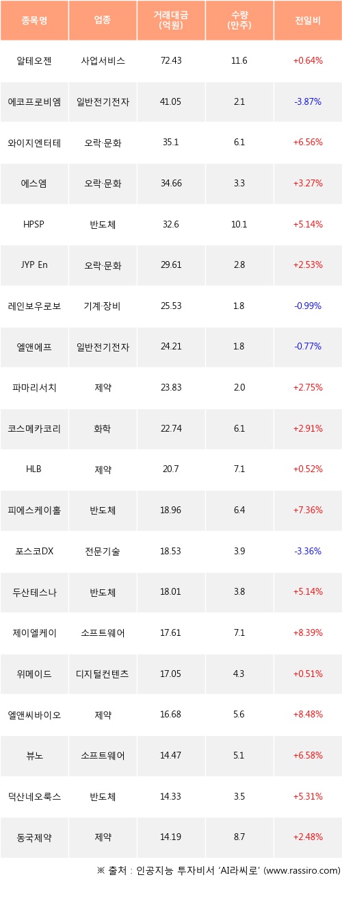 알테오젠, 와이지엔터테인먼트, 에스엠 등은 전일 대비 주가가 상승했고, 에코프로비엠, 레인보우로보틱스, 엘앤에프 등은 주가가 하락했다.