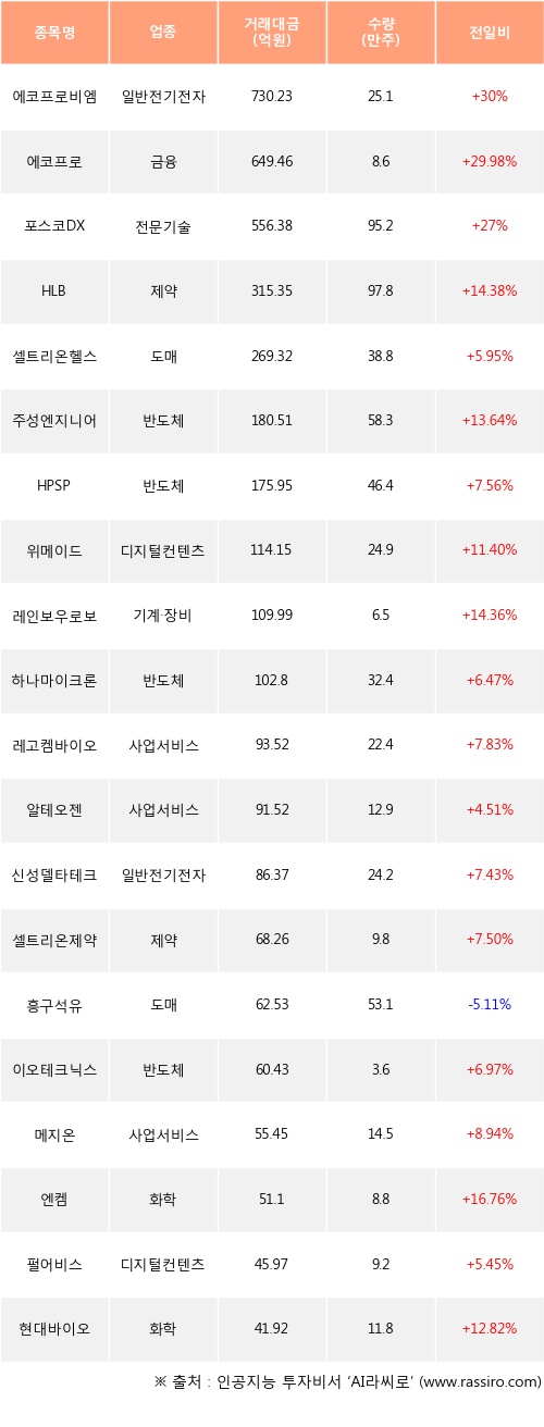 외국인 투자자의 순매수 상위 20개 종목은 에코프로비엠, 에코프로, 포스코DX, HLB, 셀트리온헬스케어, 주성엔지니어링, HPSP, 위메이드, 레인보우로보틱스, 하나마이크론등이다.