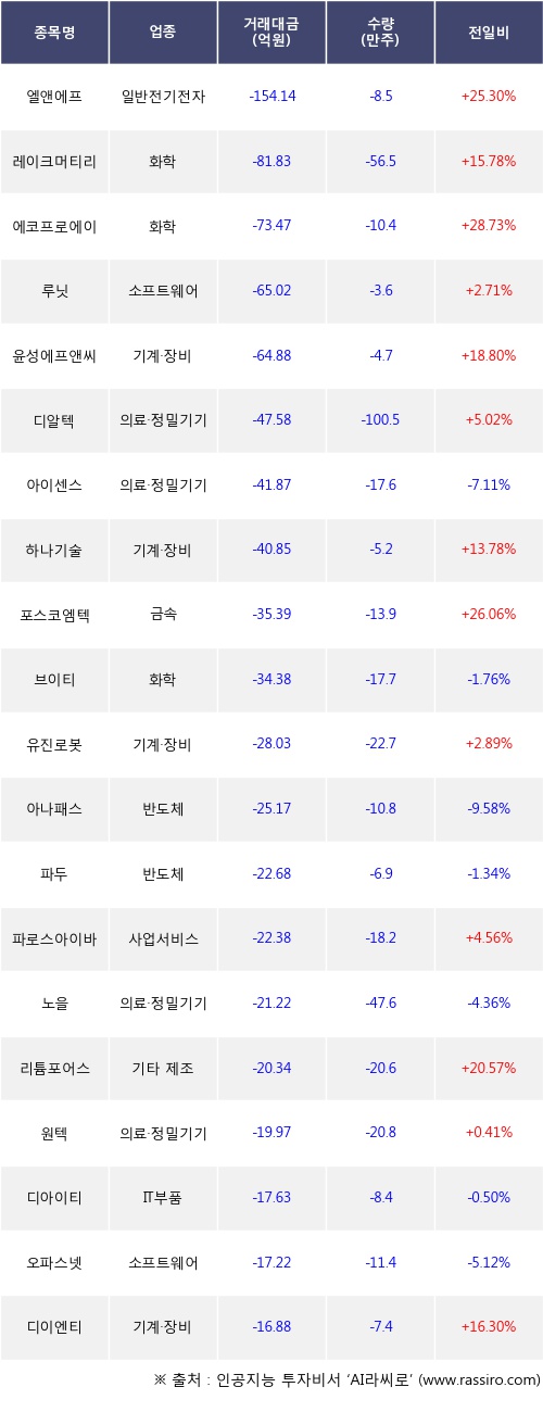 외국인 투자자의 순매도 상위 20개 종목은 엘앤에프, 레이크머티리얼즈, 에코프로에이치엔, 루닛, 윤성에프앤씨, 디알텍, 아이센스, 하나기술, 포스코엠텍, 브이티등이다.