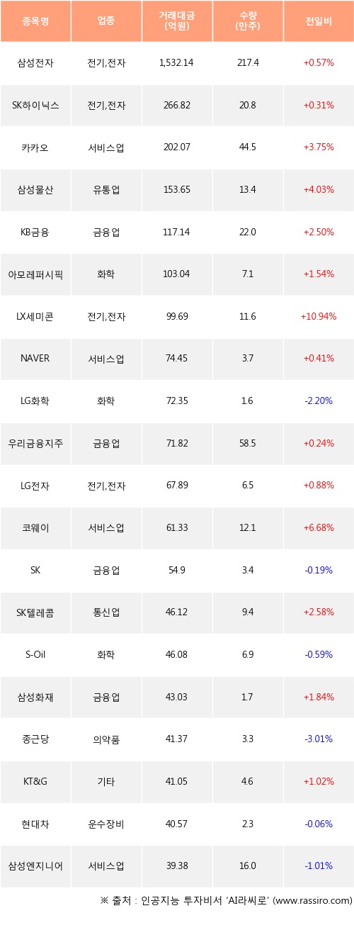 외국인 투자자의 순매수 상위 20개 종목은 삼성전자, SK하이닉스, 카카오, 삼성물산, KB금융, 아모레퍼시픽, LX세미콘, NAVER, LG화학, 우리금융지주등이다.