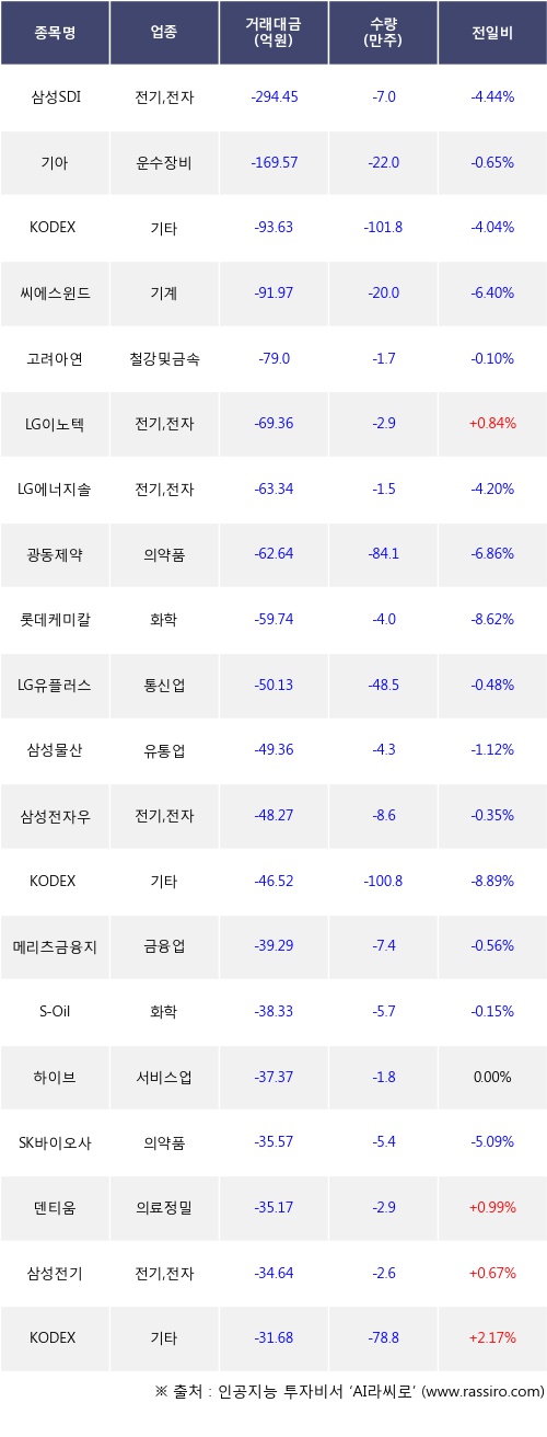외국인 투자자의 순매도 상위 20개 종목은 삼성SDI, 기아, KODEX 코스닥150레버리지, 씨에스윈드, 고려아연, LG이노텍, LG에너지솔루션, 광동제약, 롯데케미칼, LG유플러스등이다.