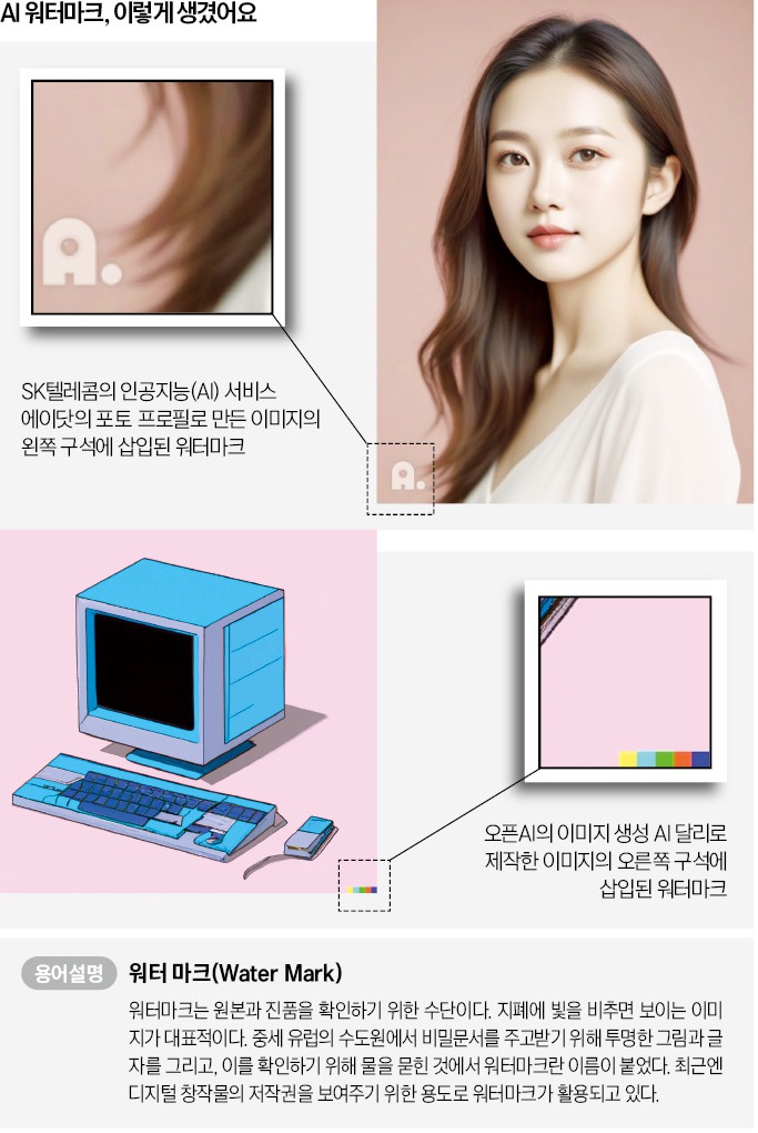 정부가 권고한 가시적 워터마크는 단어 그대로 사람이 눈으로 볼 수 있는 워터마크를 디지털 콘텐츠에 삽입하는 것을 의미한다. 기존에도 저작권이 있는 이미지 위에 도용을 막기 위해 회사 이름이나 로고를 넣는 방식의 워터마크가 쓰였다. 오픈AI의 달리(Dall-e)나 SK텔레콤의 에이닷 포토 등에서 이미지를 만들면 한쪽 구석에 AI가 제작했다는 사실을 알려주는 문구나 서비스 로고 등을 볼 수 있다.