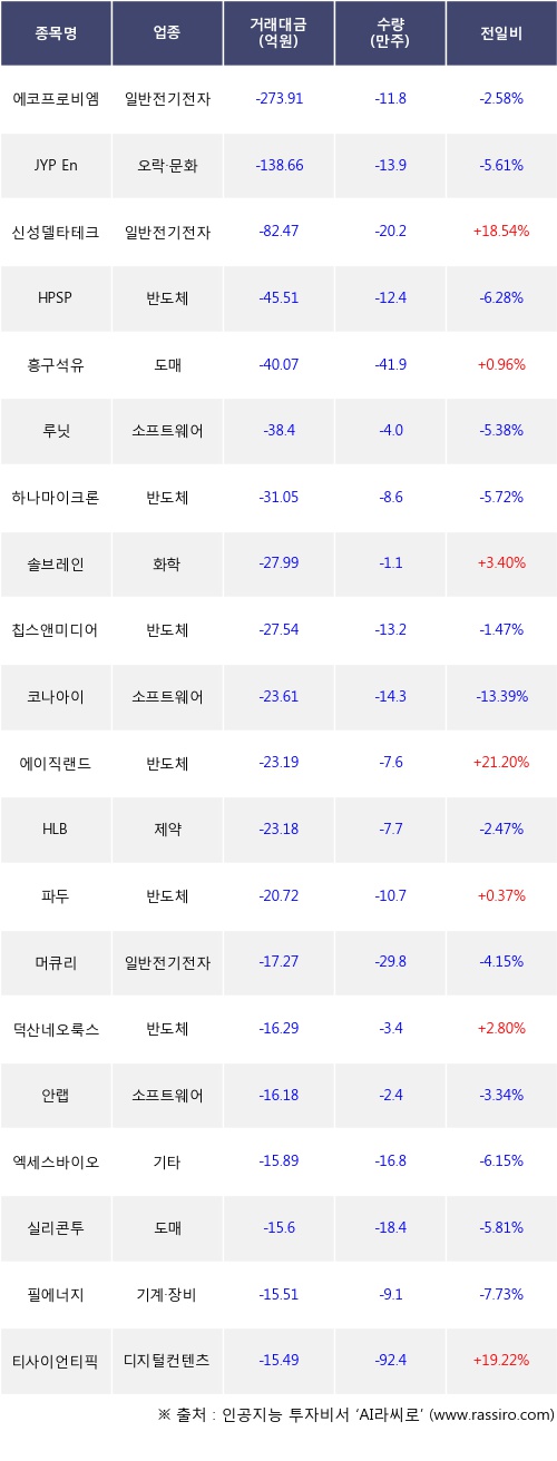 외국인 투자자의 순매도 상위 20개 종목은 에코프로비엠, JYP Ent., 신성델타테크, HPSP, 흥구석유, 루닛, 하나마이크론, 솔브레인, 칩스앤미디어, 코나아이등이다.