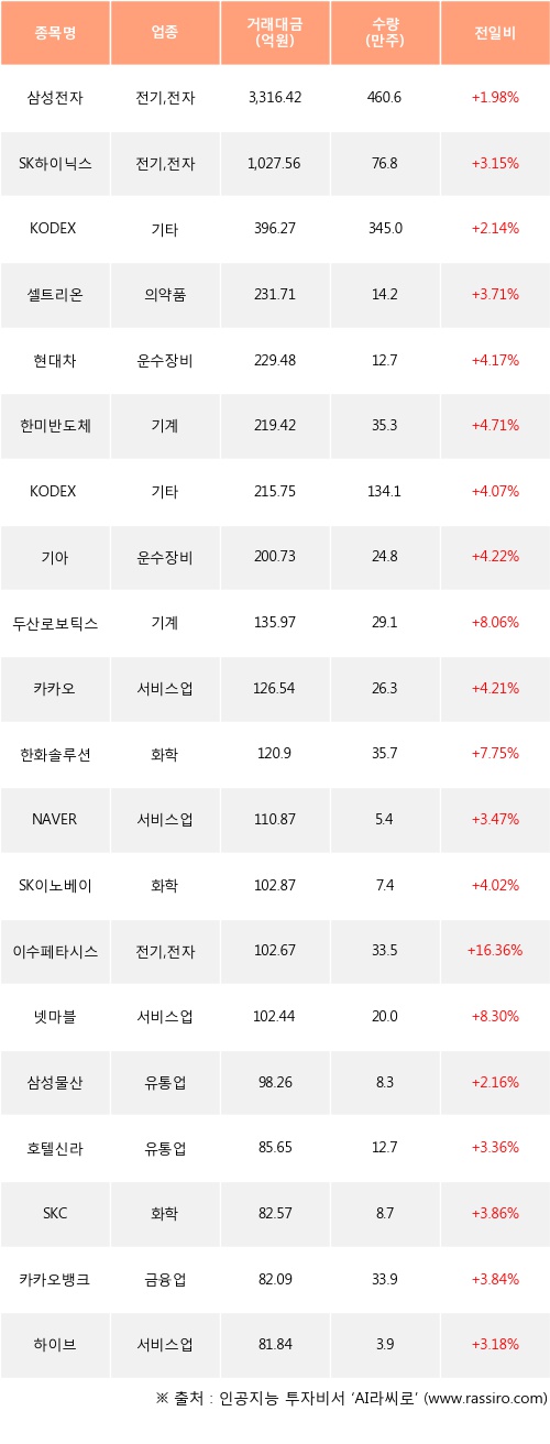 외국인 투자자의 순매수 상위 20개 종목은 삼성전자, SK하이닉스, KODEX 200TR, 셀트리온, 현대차, 한미반도체, KODEX 레버리지, 기아, 두산로보틱스, 카카오등이다.