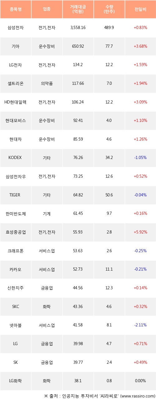 삼성전자, 기아, LG전자 등은 전일 대비 주가가 상승했고, KODEX 2차전지산업, TIGER 미국필라델피아반도체나스닥, 크래프톤 등은 주가가 하락했다.
