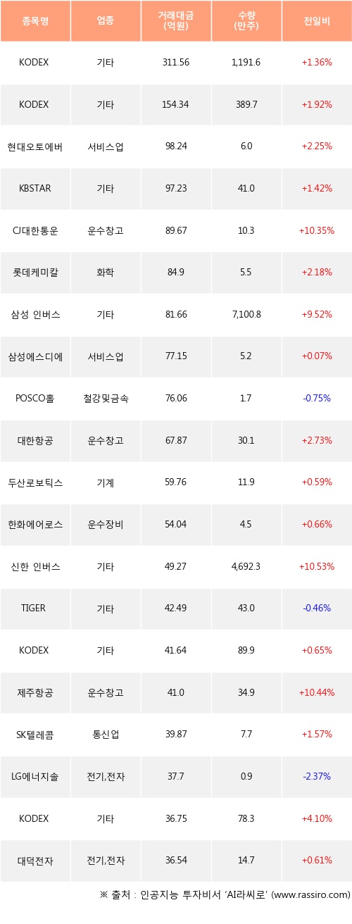 KODEX 200선물인버스2X, KODEX 코스닥150선물인버스, 현대오토에버 등은 전일 대비 주가가 상승했고, POSCO홀딩스, TIGER Fn반도체TOP10, LG에너지솔루션 등은 주가가 하락했다.