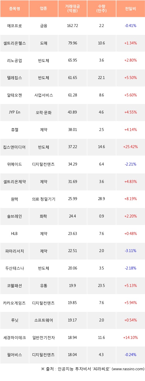 외국인 투자자의 순매수 상위 20개 종목은 에코프로, 셀트리온헬스케어, 리노공업, 텔레칩스, 알테오젠, JYP Ent., 휴젤, 칩스앤미디어, 위메이드, 셀트리온제약등이다.