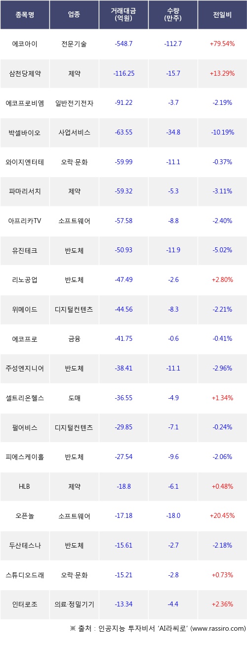기관 투자자의 순매도 상위 20개 종목은 에코아이, 삼천당제약, 에코프로비엠, 박셀바이오, 와이지엔터테인먼트, 파마리서치, 아프리카TV, 유진테크, 리노공업, 위메이드등이다.