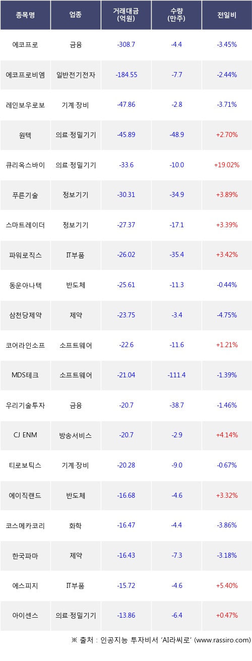 외국인 투자자의 순매도 상위 20개 종목은 에코프로, 에코프로비엠, 레인보우로보틱스, 원텍, 큐리옥스바이오시스템즈, 푸른기술, 스마트레이더시스템, 파워로직스, 동운아나텍, 삼천당제약등이다.
