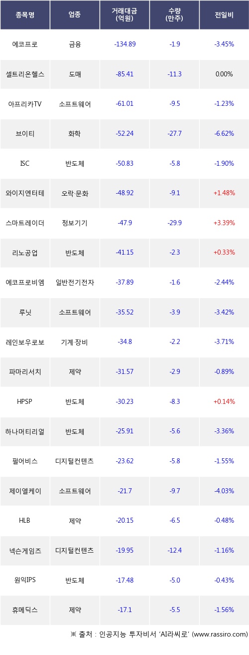 [11월22일]코스닥 기관 순매도 상위 종목