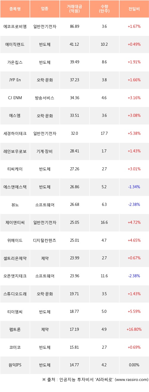 기관 투자자의 순매수 상위 20개 종목은 에코프로비엠, 에이직랜드, 가온칩스, JYP Ent., CJ ENM, 에스엠, 세경하이테크, 레인보우로보틱스, 티씨케이, 에스앤에스텍등이다.
