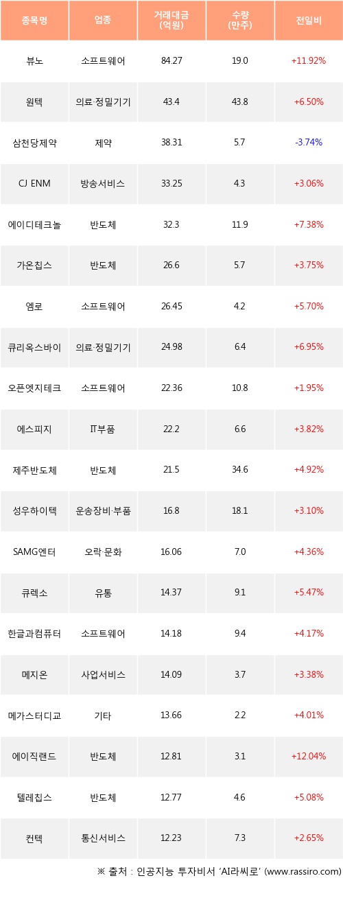 뷰노, 원텍, CJ ENM 등은 전일 대비 주가가 상승했고, 삼천당제약 등은 주가가 하락했다.