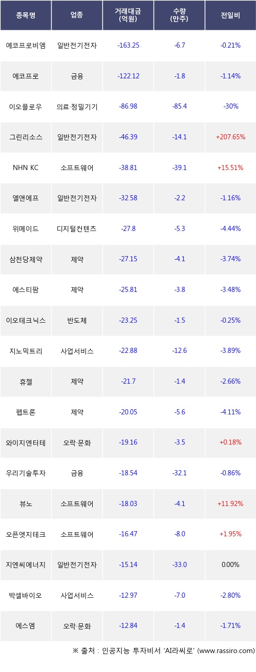 외국인 투자자의 순매도 상위 20개 종목은 에코프로비엠, 에코프로, 이오플로우, 그린리소스, NHN KCP, 엘앤에프, 위메이드, 삼천당제약, 에스티팜, 이오테크닉스등이다.