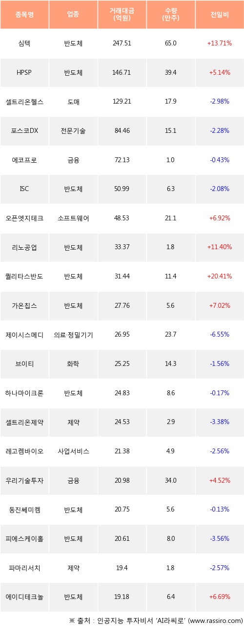 외국인 투자자의 순매수 상위 20개 종목은 심텍, HPSP, 셀트리온헬스케어, 포스코DX, 에코프로, ISC, 오픈엣지테크놀로지, 리노공업, 퀄리타스반도체, 가온칩스등이다.