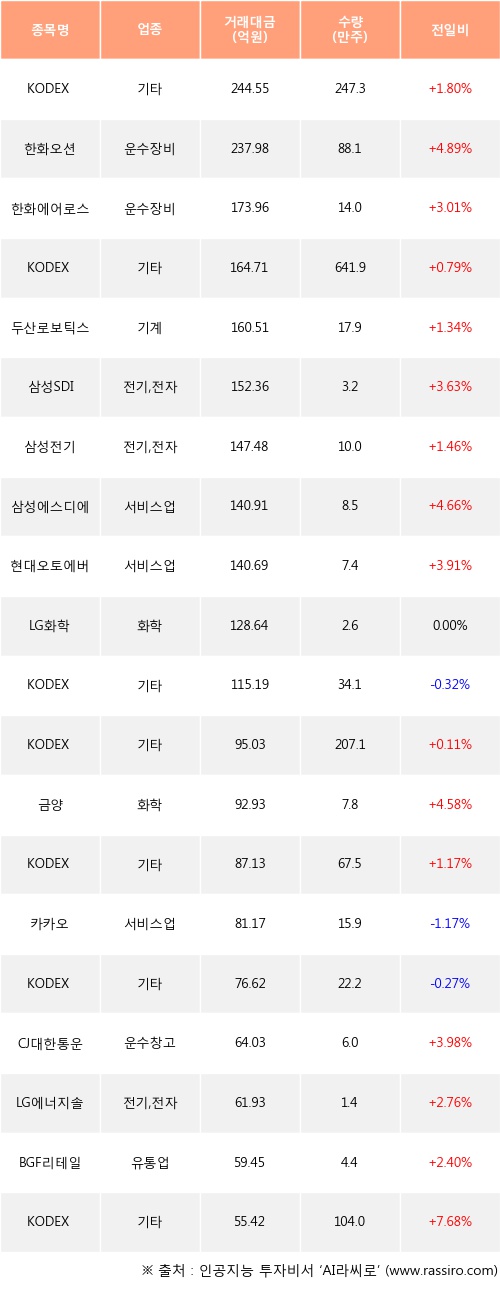 KODEX 코스닥150레버리지, 한화오션, 한화에어로스페이스 등은 전일 대비 주가가 상승했고, KODEX 200, 카카오, KODEX 반도체 등은 주가가 하락했다.