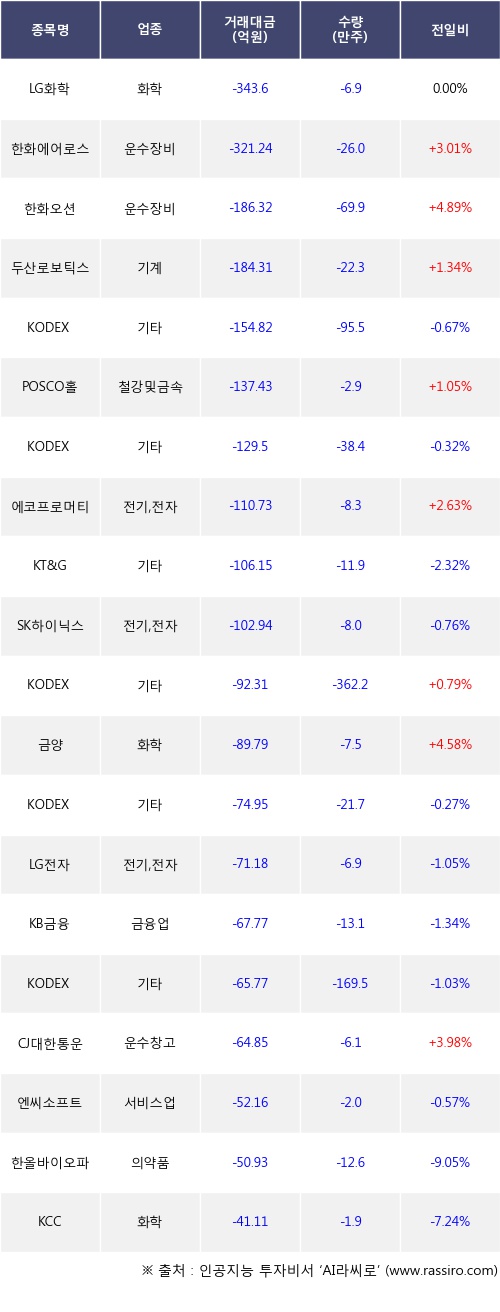 외국인 투자자의 순매도 상위 20개 종목은 LG화학, 한화에어로스페이스, 한화오션, 두산로보틱스, KODEX 레버리지, POSCO홀딩스, KODEX 200, 에코프로머티, KT&G, SK하이닉스등이다.