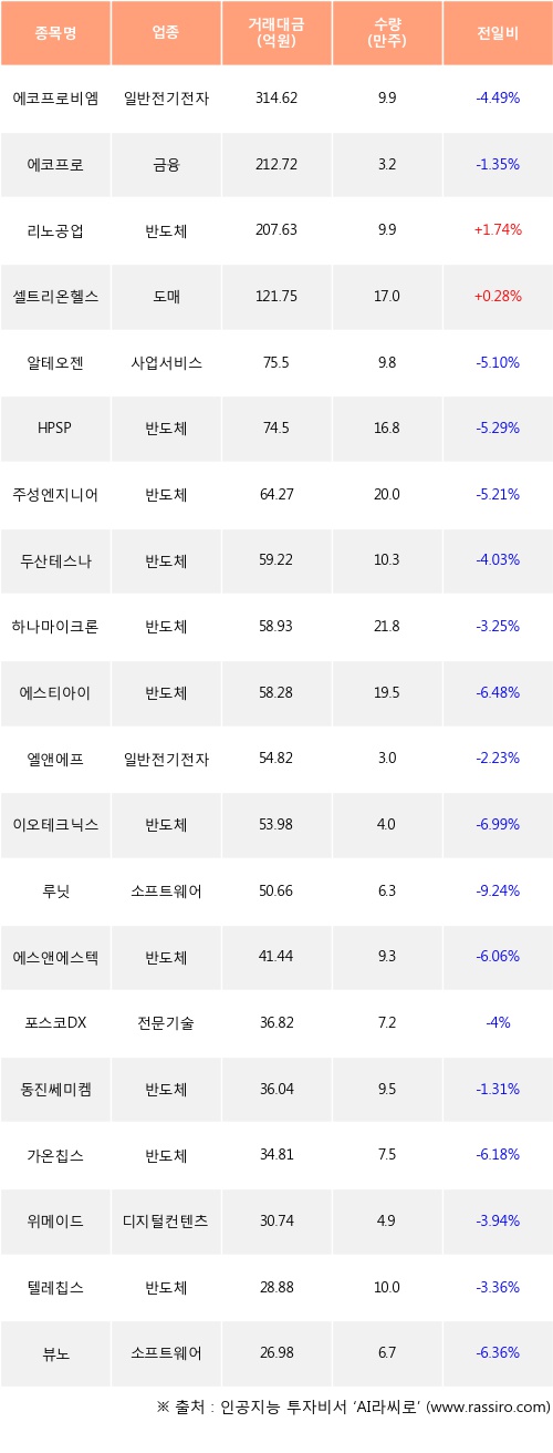 리노공업, 셀트리온헬스케어 등은 전일 대비 주가가 상승했고, 에코프로비엠, 에코프로, 알테오젠 등은 주가가 하락했다.