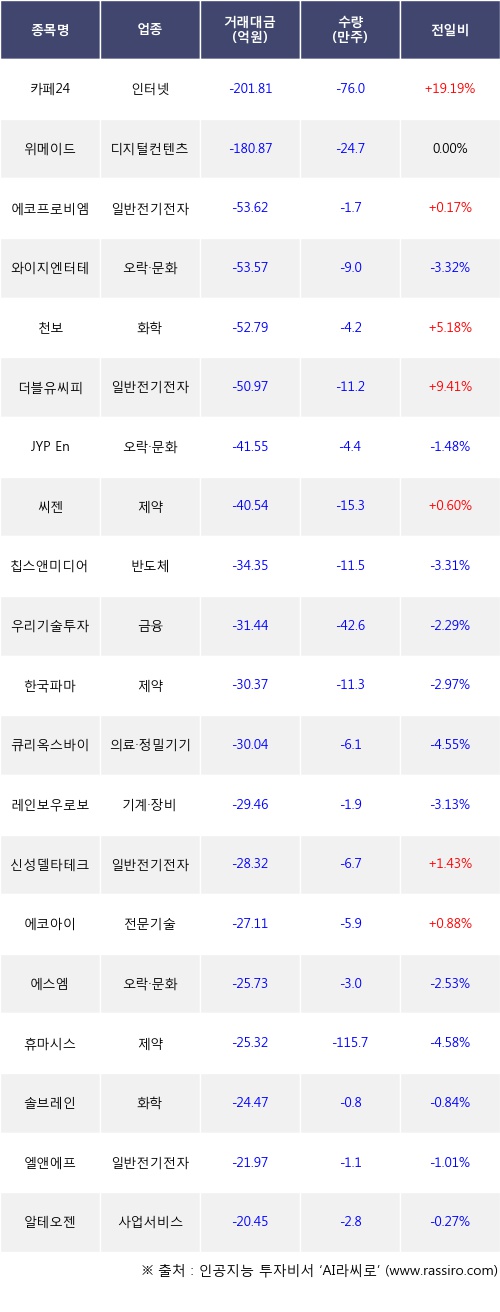 외국인 투자자의 순매도 상위 20개 종목은 카페24, 위메이드, 에코프로비엠, 와이지엔터테인먼트, 천보, 더블유씨피, JYP Ent., 씨젠, 칩스앤미디어, 우리기술투자등이다.