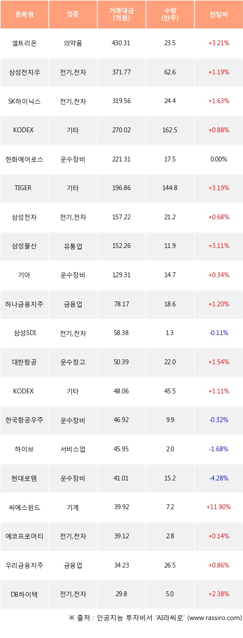 외국인 투자자의 순매수 상위 20개 종목은 셀트리온, 삼성전자우, SK하이닉스, KODEX 레버리지, 한화에어로스페이스, TIGER 미국필라델피아반도체나스닥, 삼성전자, 삼성물산, 기아, 하나금융지주등이다.