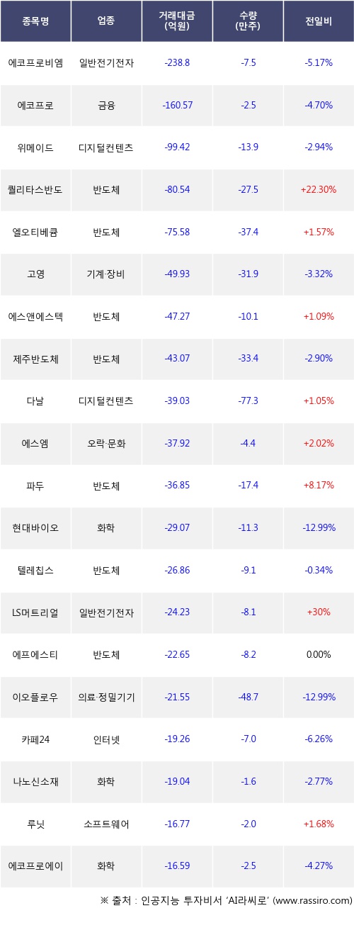 외국인 투자자의 순매도 상위 20개 종목은 에코프로비엠, 에코프로, 위메이드, 퀄리타스반도체, 엘오티베큠, 고영, 에스앤에스텍, 제주반도체, 다날, 에스엠등이다.