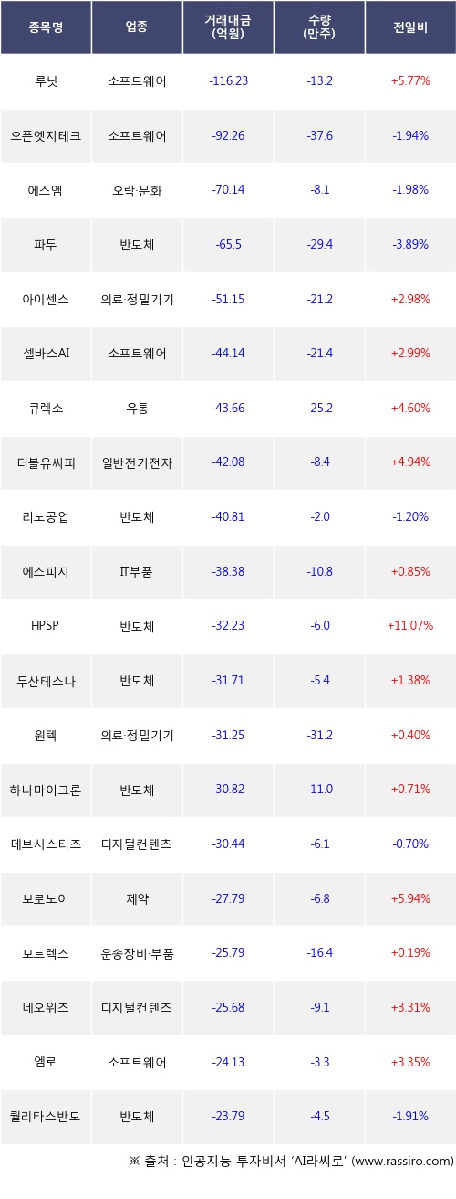 외국인 투자자의 순매도 상위 20개 종목은 루닛, 오픈엣지테크놀로지, 에스엠, 파두, 아이센스, 셀바스AI, 큐렉소, 더블유씨피, 리노공업, 에스피지등이다.