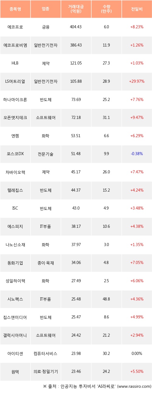 에코프로, 에코프로비엠, HLB 등은 전일 대비 주가가 상승했고, 포스코DX 등은 주가가 하락했다.